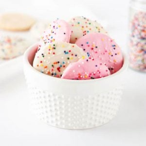 - To dip, follow the instructions on the package to melt 1 package white almond bark in a glass bowl. Once melted, add in food coloring and mix until color is smooth. (Like I mentioned above, I also like to add a few tiny drops of vegetable oil to the melted almond bark to prevent it from hardening so quickly.) Using a fork, carefully dip each cookie into the bark and tap excess bark off the cookie before setting it on the parchment paper. After set on the parchment, top with sprinkles and allow to full harden before enjoying!
