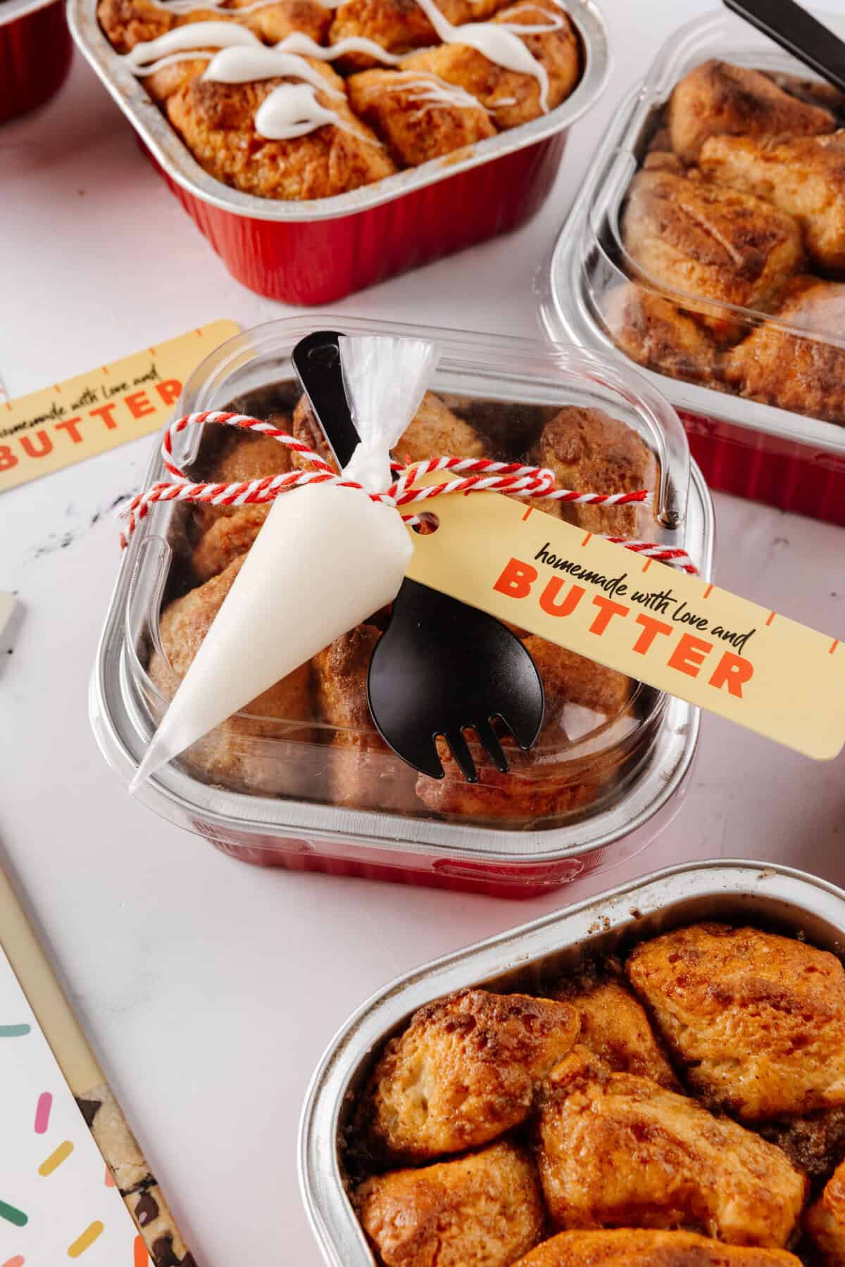 The idea is that the recipient can warm up the monkey bread and drizzle the icing on themselves! Just remind them to remove it from the foil pan if they plan to microwave it. 😅