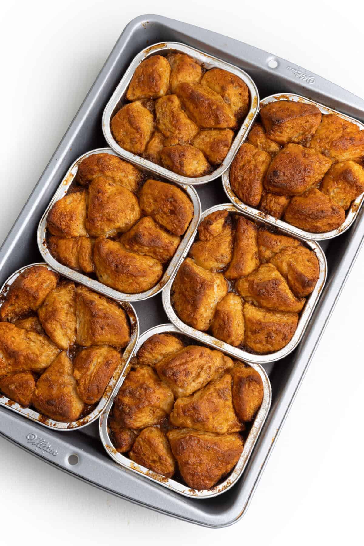 In addition to baking the monkey bread in a 9x13-inch pan for the November Bake & Take Challenge, you can also bake it in small tins for individual servings for gifting! Each one comes out to about $1.25 if you grab the biscuits on sale or from ALDI. Total steal!