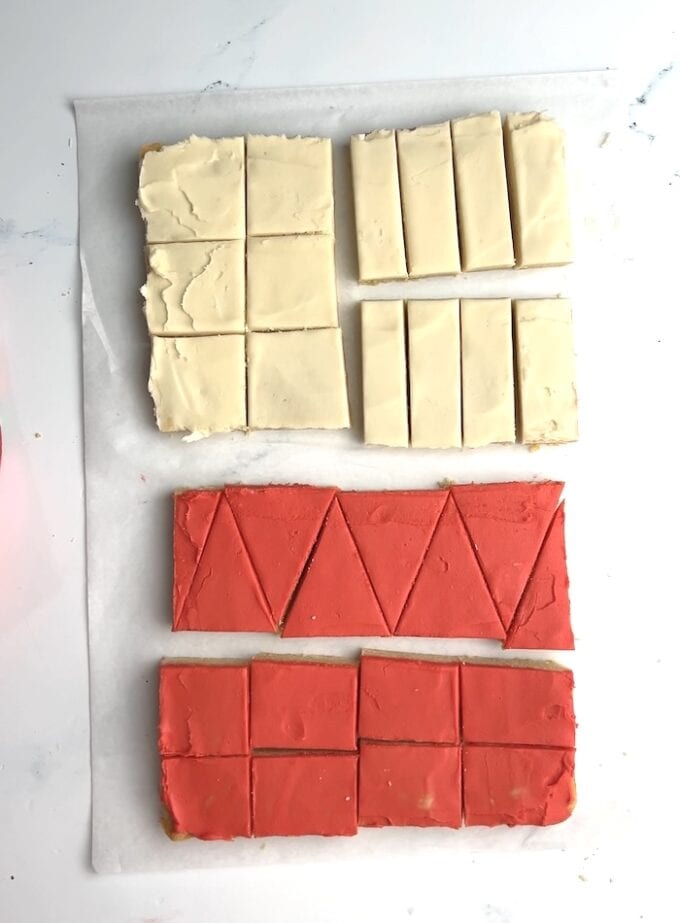 - Cut the baked 9×13" bars in half horizontally. Spread a thin, even layer of white frosting over the top half and red frosting over the bottom half, using just enough to fully cover the surface without the cookie showing through. Set aside the remaining frosting for piping the details.Let the frosting firm up for about 5-10 minutes to get cleaner cuts. Cut the different shapes according to this diagram: