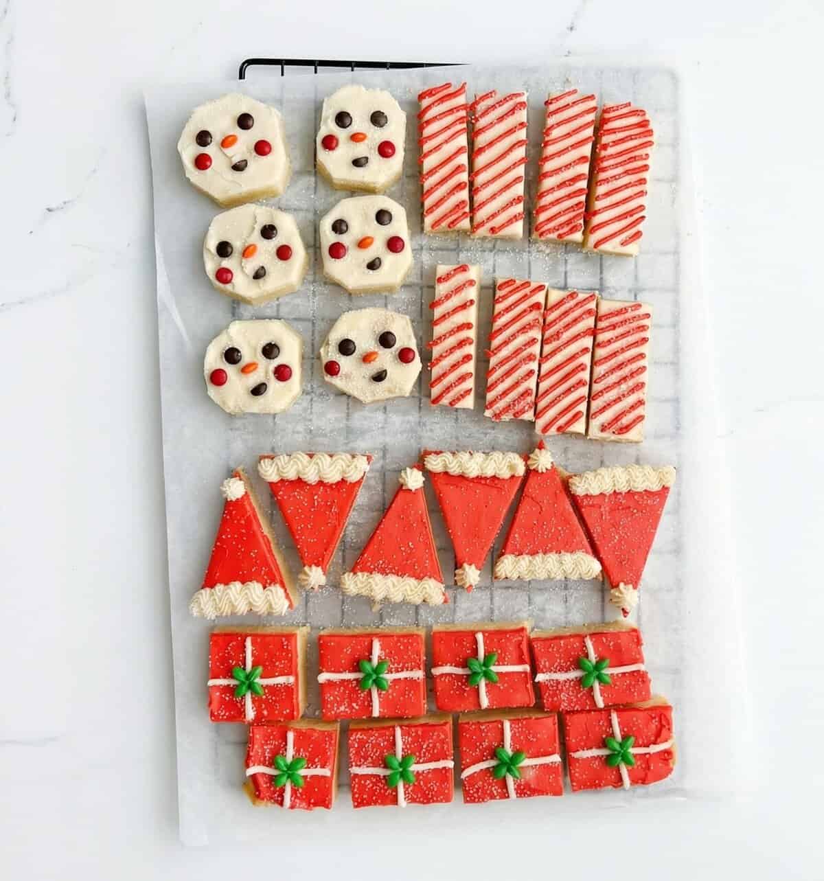 - Transfer the remaining frosting to piping bags, snipping a small tip off each, and use it to pipe the lines on the candy cane sticks and gift designs.Use mini M&M's to create the snowman faces and bows on the gifts. To pipe the Santa hats, place the white frosting piping bag inside a second piping bag fitted with a star tip.Note: This frosting firms up quickly, so add any sprinkles immediately after decorating!