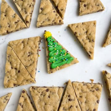 Turn my popular cookie cake recipe into adorable Christmas trees for your holiday platters. Just one 9×13 pan and no cookie cutters needed.
