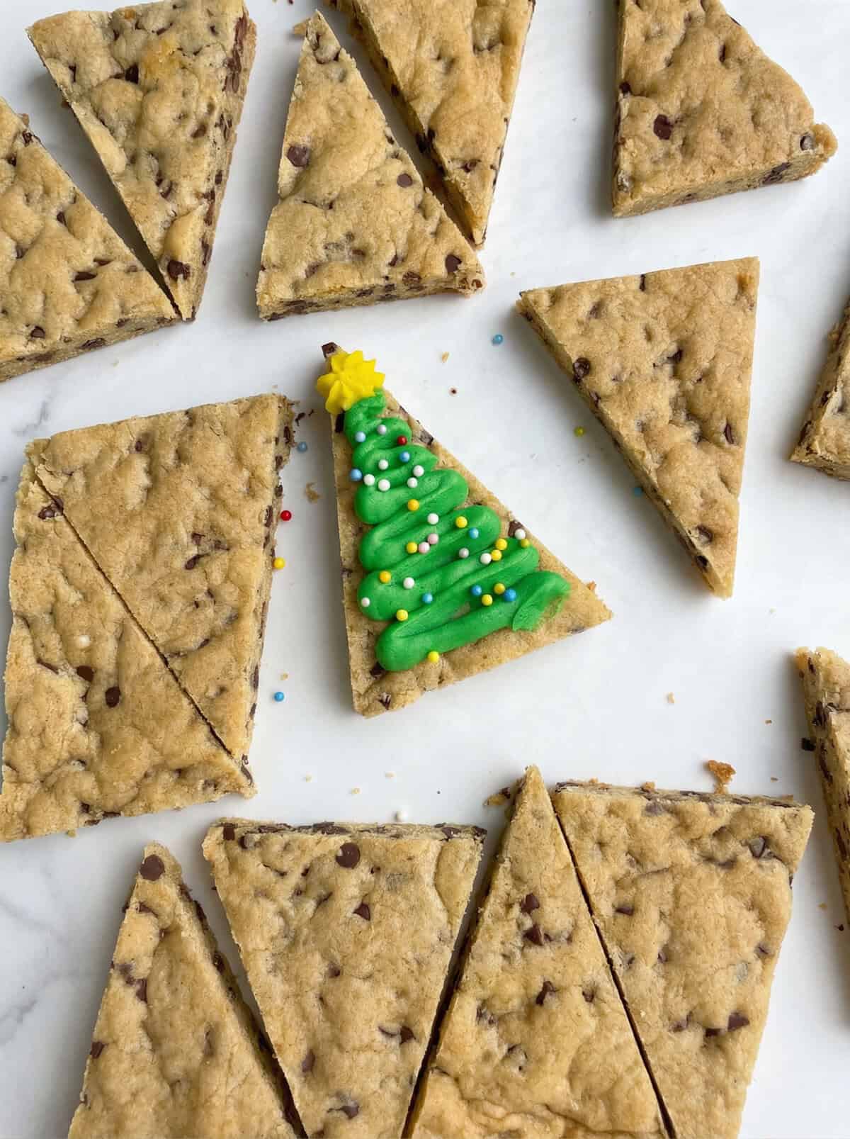Turn my popular cookie cake recipe into adorable Christmas trees for your holiday platters. Just one 9×13 pan and no cookie cutters needed.