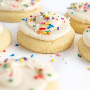 The BEST Fluffy Sugar Cookies topped with a creamy buttercream frosting! With a super soft, cake-like texture, these cookies are bakery-level delicious. Color the frosting & decorate with festive sprinkles to customize to any holiday or occasion!