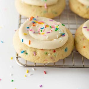- Incredible texture: these thick birthday cake cookies with frosting have a dense, chewy texture that is at the same time so soft and luscious. If you've ever tried my all-time favorite lemon sugar cookies, this recipe uses that same incredible base dough! No premade cake mix or oil here.