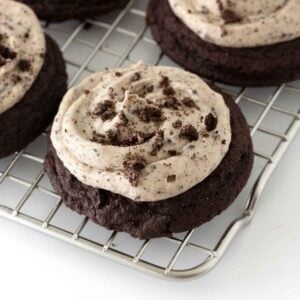 This recipe is amazing! I made these cookies and they are my boyfriend and roommates favorite cookie so far! The frosting tastes like a delicious cookies and cream frosting and is perfect with the cookie