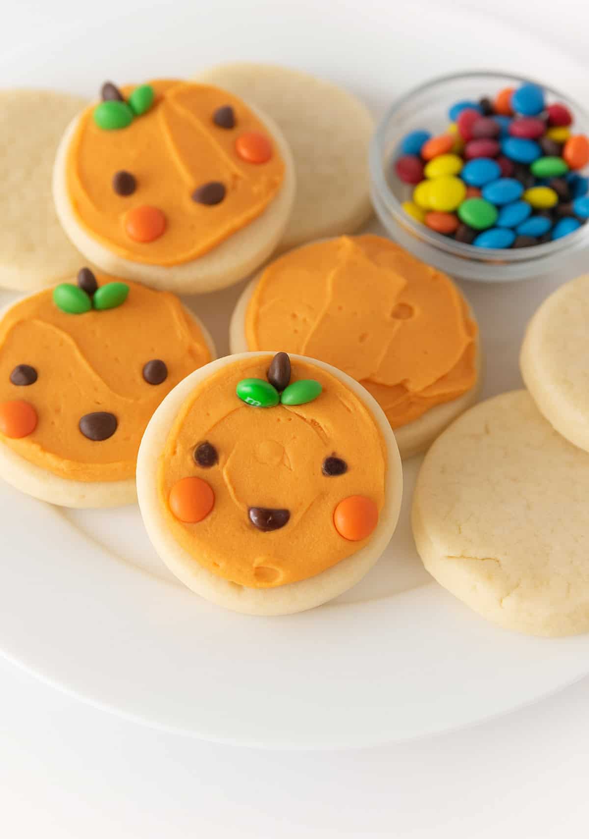 Gather up the kids and get ready to make the cutest and EASIEST pumpkin cookies this Halloween! No fancy decorating or piping skills needed - a circle cookie, frosting, and some mini M&M's is all it takes to make these adorable Halloween pumpkin cookies!