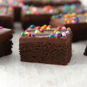 - Gluten Free: I have tested this recipe using Bob's Red Mill 1-to-1 Gluten Free All-Purpose Flour and I thought the results were great (they're a bit less fudgy but a couple friends couldn't tell they were gluten free!). Since I used a gluten-free flour that is a 1:1 replacement, you can use the same amount of regular flour in place of it. If you make this gluten free, be sure to let me know how it worked and how you liked it! ***Be sure to check that your rainbow chips are gluten-free, as some brands are not (Sweetapolita's are GF - use promo code "DESIGNEATSPRINKS15" for 15% site-wide!)