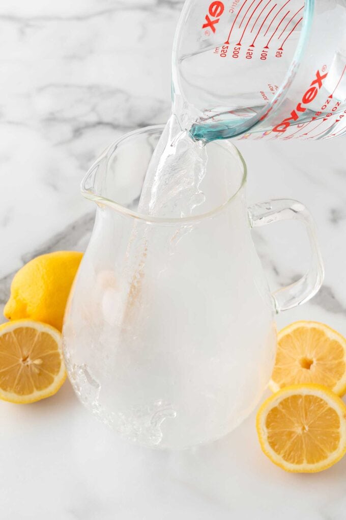 - Stir in cold water (3 cups) and fresh lemon juice (ยพ cup) until sugar is dissolved.