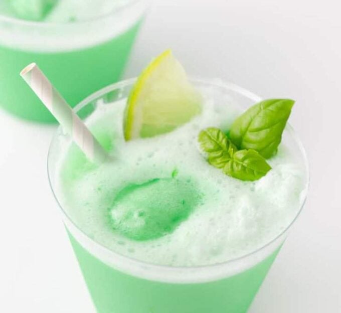 - To create the picture-perfect presentation, gently place the remaining sherbet scoops and the lime slices on the top of the liquid so they float. Finish off with fresh basil leaves, if desired. (For kid's parties, just leave out the fancy garnishes!)