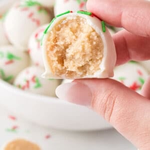 Tip: You can make sugar cookie truffles without cream cheese by using frosting instead. My Sugar Cookie Buttercream Frosting works well, or buy a can of frosting at the grocery store, like Pillsbury. If making homemade buttercream, they'll be a bit stickier so you'll want to refrigerate the "dough" before rolling into balls.