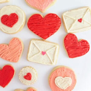 - Tools: You'll also need a rolling pin (read more about my favorite rolling pin here), parchment paper, heart cookie cutter, circle cookie cutter, knife (to make rectangle envelopes), piping bag, butter knife or offset spatula, and Wilton heart sprinkles (you can also just pipe the heart on the envelope)