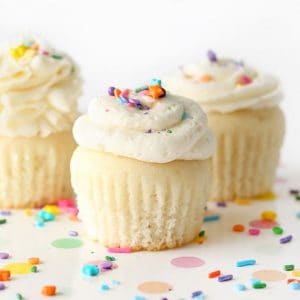 My personal favorite frosting for these is a delectable cream cheese frosting. It's not too sweet and is the perfect pairing with these vanilla cupcakes. If you want a more pipeable frosting, try out a buttercream frosting like I use on sugar cookies.