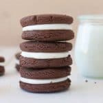 To make filling, beat the cream cheese (4 ounces), softened unsalted butter (¼ cup, i.e., ½ stick), vanilla extract(½ teaspoon), and melted white chocolate chips (¼ cup) on high speed with an electric mixer for 30 seconds. Add in powdered sugar(½ cup) and continue to beat for another 30 seconds. Pipe 1 tablespoon of filling between each "pair" of cooled cookies.