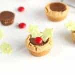 Make these easy Christmas Holly Cookie Cups using my go-to peanut butter cup cookie recipe, red M&M's, and piped white chocolate! A fun way to add some color to traditional Christmas cookies!
