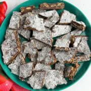 Once firm, lift the bark out using the parchment paper, lightly dust the top with powdered sugar (a sieve or fine-mesh strainer works best), and cut or break into pieces.